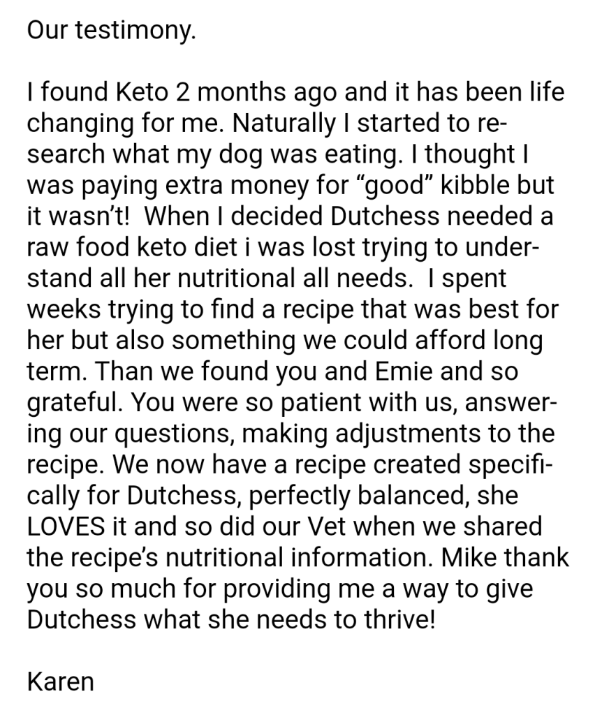 The amount of information out there on the internet for ketogenic diets for humans is mind boggling, but there is very limited information you will find for dogs. Or what you might find for dogs is written by someone with no long term real world experience of actually implementing and training others on how to properly do it.