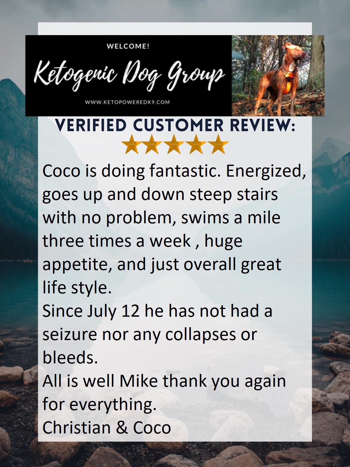Now, just over 2 months on a custom formulated Raw keto diet and CoCo has a new lease on life right now. No seizures in 2 months since starting the diet, no bleeds, increased energy and is working out twice a day with his owner and literally doing 1 mile swims 3x a week. I know dogs half his age, that are healthy, that can’t even do that!