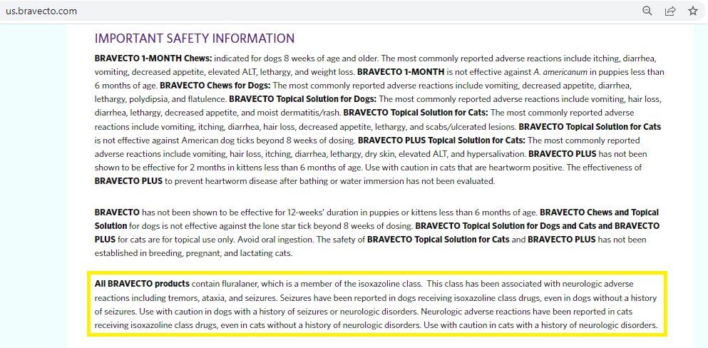 the photo above shows the latest updated “Important Safety Information” for Bravecto from the pharma’s website in 2023- so by their OWN ADMISSION, their product is known to cause these very serious life-threatening issues! yet its still sold, often times with NO VERBAL warnings to pet owners- and unfortunately, most pet owners never bother to read the tiny pamphlet warnings inside the box of medications that contain this info. so they never know the risk they are taking using these drugs.