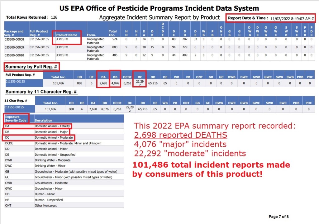 “No other pesticide product has been the subject of this many incident reports, which include 1,698 complaints linking the product to pet deaths and nearly 700 involving harm to people.” – The Center for Biological Diversity– regarding Seresto collars.