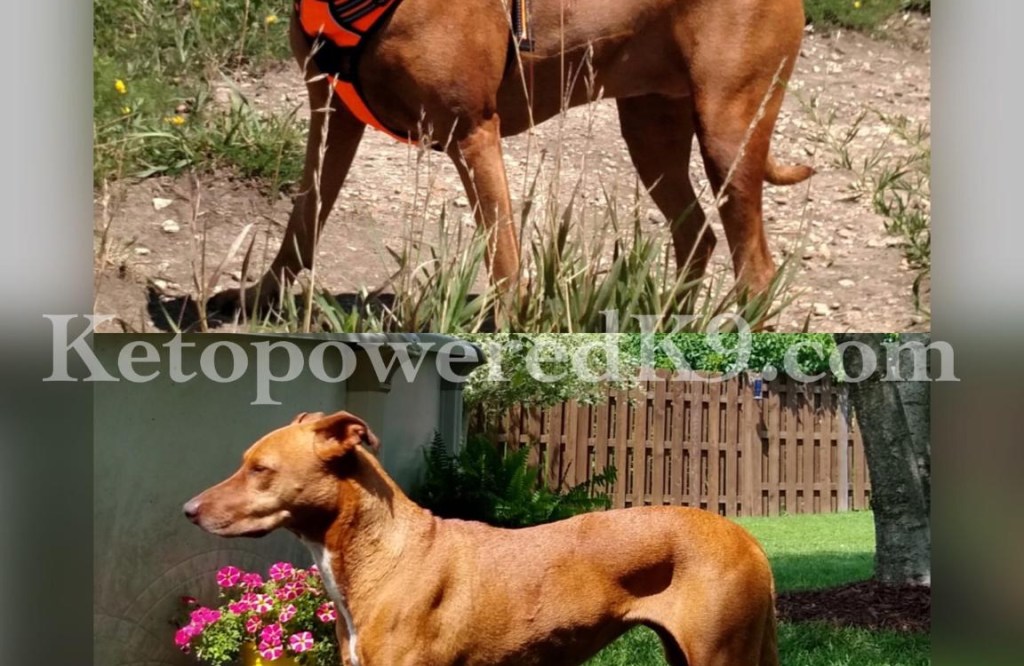 Now the photo above was 6 weeks after starting a Raw ketogenic diet. She dropped a lot of weight fast from the diet being very calorie restricted, virtually ZERO carbs, and absolutely ZERO additional treats. 2 meals a day and nothing more. Combined with a rigorous running schedule, swimming, and your basic walks around the block. And keep in mind that the calories she is being fed on keto now are almost the same as what she was fed on Kibble. So this just goes to show you how all of those carbohydrates affect the body! it turns to sugar and then stored as fat in their bodies.