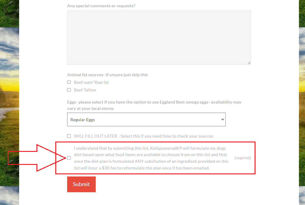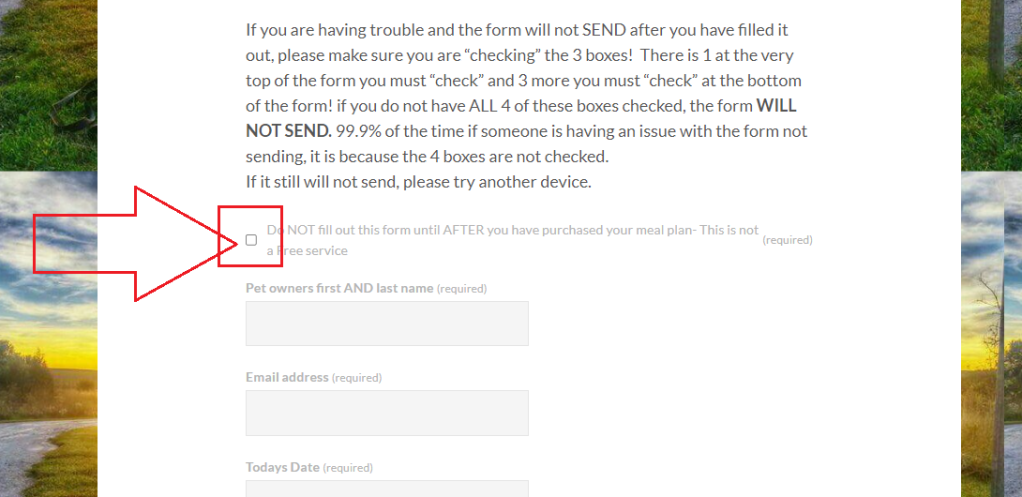 If you’re having trouble submitting and sending in the information forms for the Ketogenic Meal plan program, this typically only happens when the “check boxes” are not checked. On a tablet or phone with a small screen, these checkboxes can easily be overlooked sometimes. especially the 1 up top